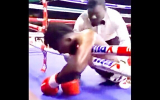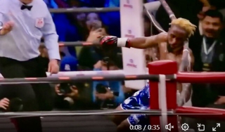 更にとどめの強烈な左を打ち込むと、挑戦者の顔が天を仰ぎ、ロープまで吹っ飛ばされた。目の焦点が合っていないが果敢に立ち上がるもグラつき、レフェリーは試合を止めた。