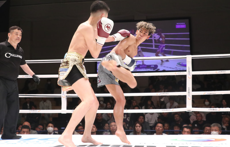 星(右)はJINを下してWBC ムエタイ日本統一バンタム級王座決定トーナメントを勝ち抜き、決勝で嵐と対戦する