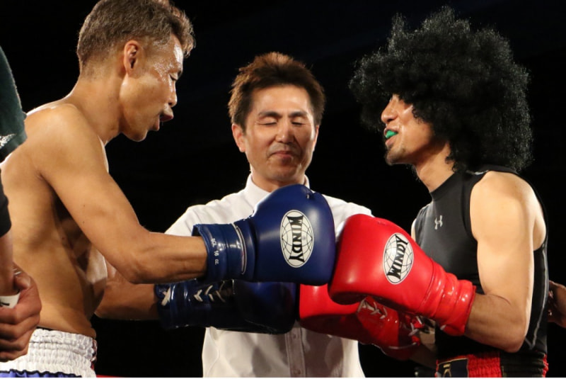 レフェリーの試合前の注意を聞くガラちゃん(右)