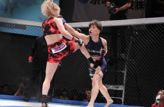 1R、SAAYAは右ストレートをヒット。そして蹴りをヒットするも、彩綺が組み付いて振り回す。離れると彩綺の左ミドル、ヒザ蹴りがボディへ突き刺さる。動きが止まったSAAYAだが、ワンツースリーからのミドルキックで反撃する場面もあった。