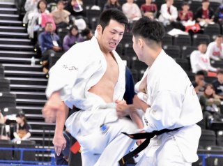 対抗のJFKO全日本優勝・多田大祐(白蓮会館)も、長身で大技連発の相手に手を焼くも、延長で判定勝利し2日目へ駒を進めた。