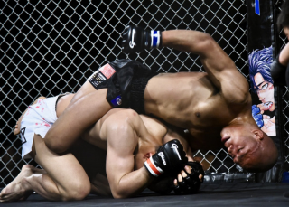 2R、右ミドル、右ストレートと攻撃を当てる芳賀は、林の飛びヒザを避けてテイクダウン。立ち上がって逃げる林のバックに付く芳賀はバックマウントからパウンド。
