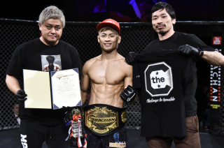 フルマークの判定勝ちで新王者に輝いた芳賀は「俺がチャンピオンだよ、バカヤロー! 試合を見ていただいた通り、僕はもっと強くなれると思っています。穴がたくさんあるし、普段は緊張しないのですが、今回はめちゃくちゃ肩が震えて、やりきれない部分もありました。これからも僕の成長を一緒に見ていただいて、さらに大きな舞台で強い選手と戦えるように頑張っていきますので、よろしくお願いします。林RICE、美味しかったです。ごちそうさまでした!」とアピールした。