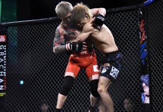 1R、プレッシャーをかける芳賀の前に、林は下がる展開に。林は組み付くが、芳賀はテイクダウンに成功して細かいパンチを入れていく。