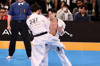5月31日~6月1日東京・有明アリーナにて開催された『第2回国際フルコンタクト空手道選手権』男子重量級・決勝戦では、23年の新極真会 世界大会・5位の岡田侑己(新極真会 和歌山)が、工藤昴朗(新極真会 世田谷・杉並)を豪快な胴回し回転蹴りで技ありを取り、本戦5-0で勝利、優勝した。