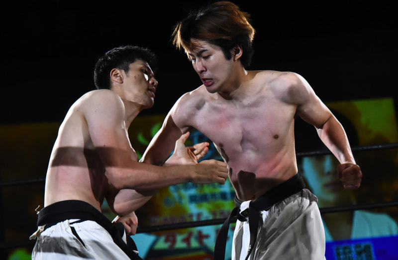大橋瑞毅(左)を突きで追い込む加藤琉雅(右)