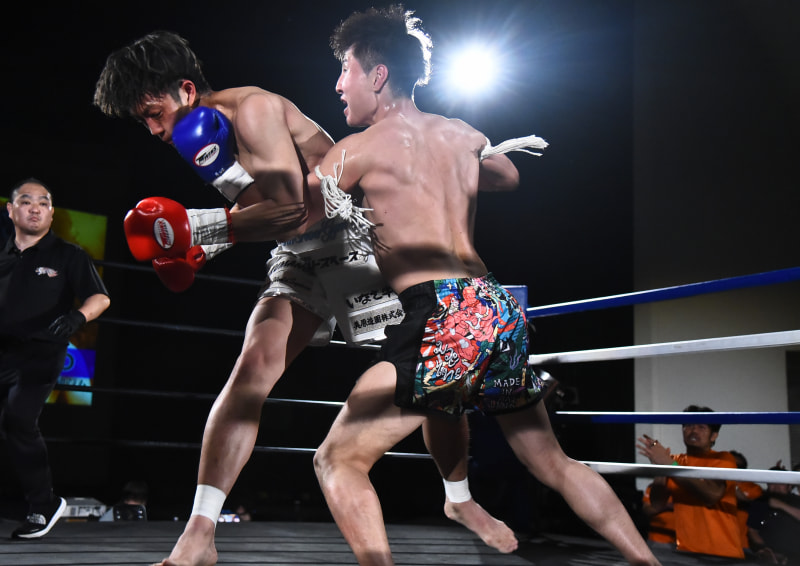 竹内賢一(左)に判定勝ちし、ベルトを獲得した大稚YAMATO(右)