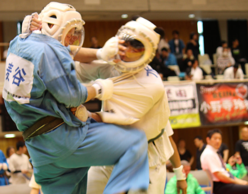 準決勝での麦谷(青)。水村健太郎に膝蹴りを叩き込む