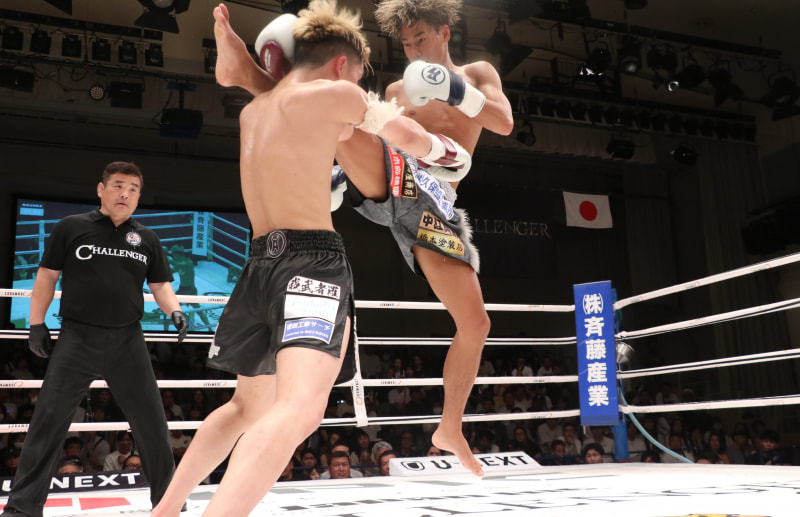 星(右)は飛びヒザ蹴りで嵐に襲い掛かった