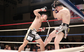 1R、サウスポー構えの橋本は前足へのカーフ、三日月蹴りをボディへ突き刺していく。水本は飛び込んでの右、左のパンチを振る。橋本も打ち合うが、水本の方がパンチは上か。