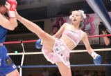 ・“リアル春麗”木村萌那、ピンクのミニ衣装で計量パス!鍛えた脚&肩筋を見せる