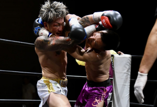 1R、トリッキーな動きから変則的な足技を繰り出す耀織はバックブロー。HAYATOは組んでからのヒジ・ヒザを当てて削っていく。2Rも耀織の距離を潰すHAYATOが組んでからのヒザ蹴りでペースを握ったまま。