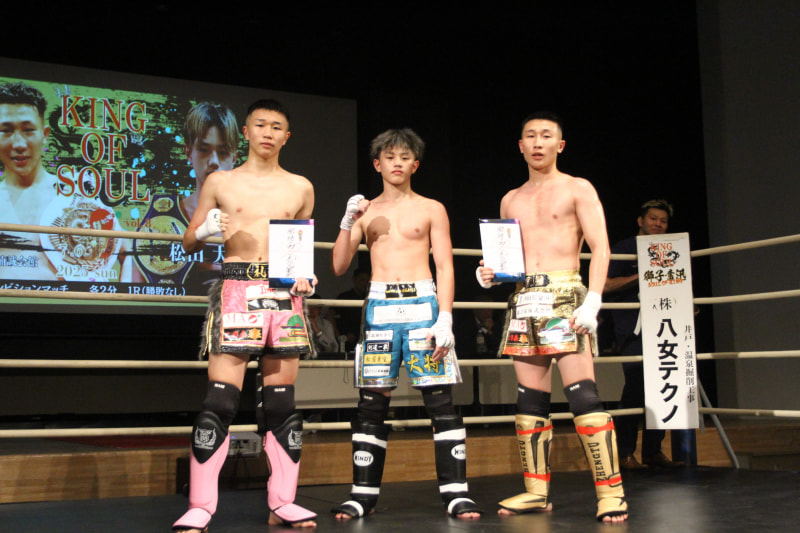 エキシビションマッチを行った(左から)礼司、松田大将、JIN