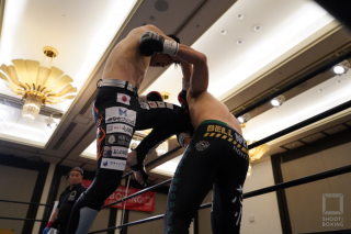 1R、プレスをかける濱田に、啓人は細かく左ジャブを突いて左ロー、ワンツーも当てていく。後手ながらも濱田は右ロー。啓人は下がりながら左フックを当て、残り10秒のところで首投げを見舞ってシュートポイント奪取。