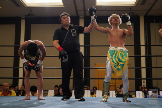 1R、プレスをかける岡本はパンチ主体の攻めを見せ終盤にはラッシュ。久留は冷静にさばいてミドル返す。2R、岡本はワンツー、左ミドルを出しながらじりじりと詰め、久留もジャブ、前蹴り、右ローと攻撃を返してペースを握らせない。3R、手数の減った岡本に、久留は顔面前蹴り、左ミドル、右ローと攻撃を散らしてパンチにつなぐ。最後は久留が顔面前蹴り、ワンツーとヒットさせる場面を作った。判定2-1で久留が勝利。