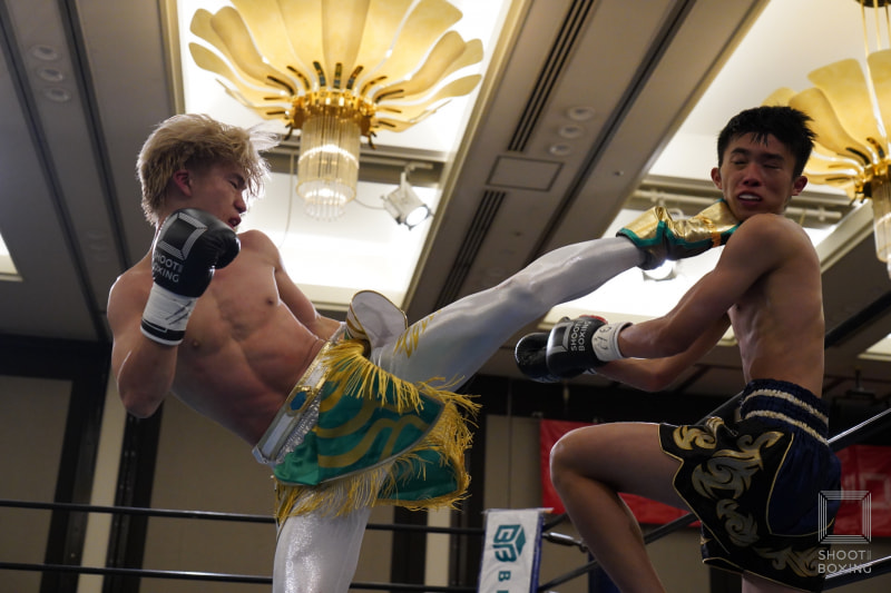 ライジング蓮太(右)に左ハイキックを見舞う岡本翔悟(左)