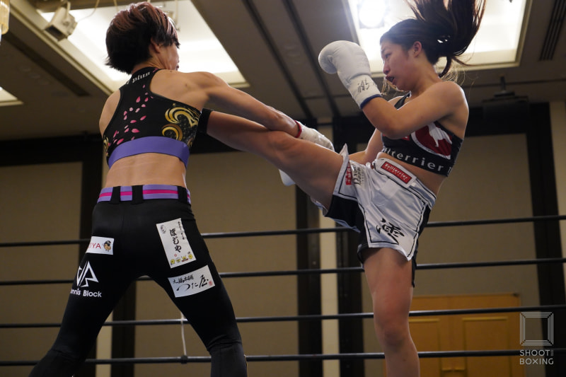 TSUMIKI(左)に右ハイキックを見舞う矢代澪(右)