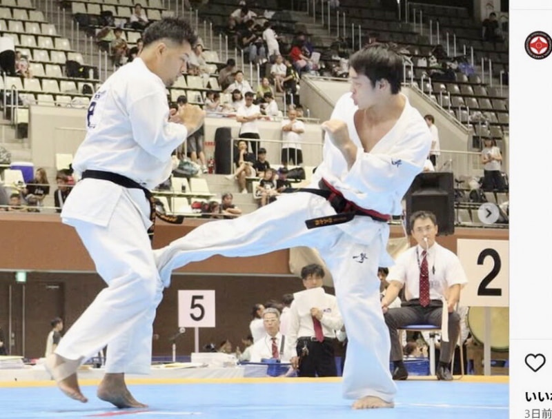 男子-90kg級優勝・大秦零司(右)の強烈なロー@ iko.kyokushinkaikan