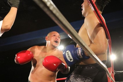 ロープにザキオ(右)を追い詰めるGARU(左)