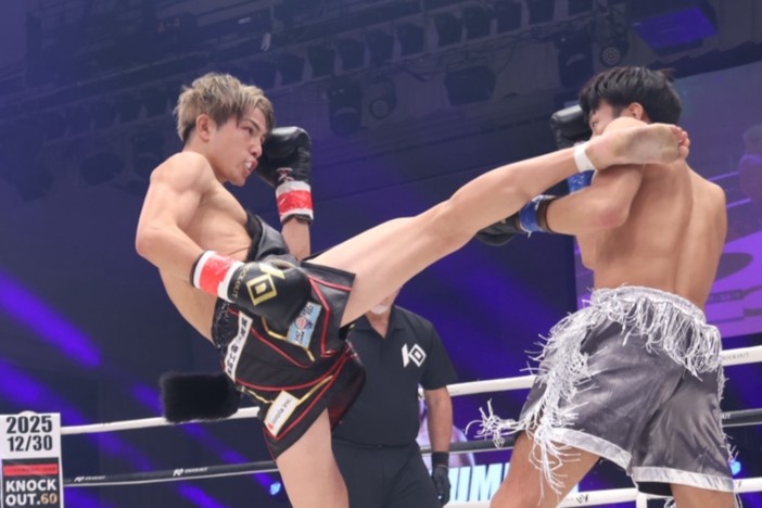 蹴りを放つ玖村(左)