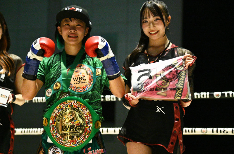 アイドルグループ『Red Radiance』のメンバーで妹のChara(右)が今大会のラウンドガールを務め、姉の藤原乃愛を祝福した