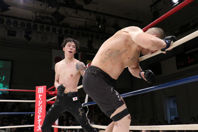 樋沼(右)がよろけて倒れる衝撃ダウン
