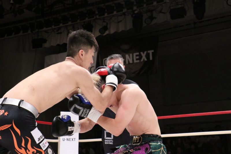 川上のヒザで相手が崩れ落ちる