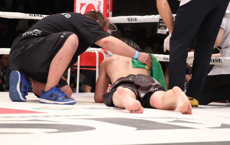 梅井はバッティングで試合続行不可能に。倒れたまま勝ち名乗りを受けた
