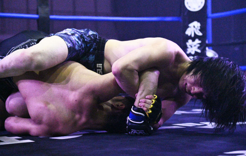 小沼魁成(上)が菊池元(下)にアームロックを仕掛ける