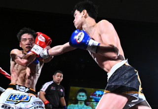 1R、左インロー集中打の國本に対し、ジャオはプレッシャーをかけながらリーチを活かしたパンチで流れを掴む。2Rも前進の止まらないジャオに、國本は左インロー、右ローをこつこつ当てていく。