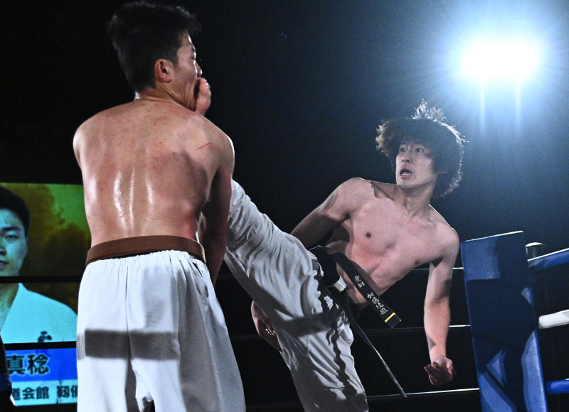 加藤琉雅(右)が向江真稔(左)に上段蹴りをクリーンヒット