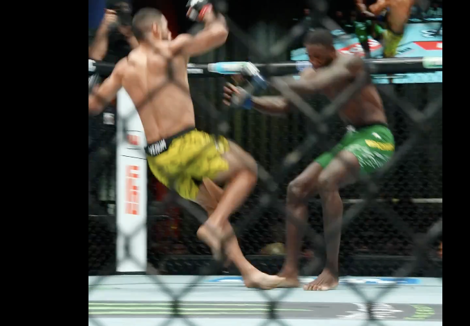 ボンフィム(左)のヒザ蹴りで相手がダウン!©️UFC
