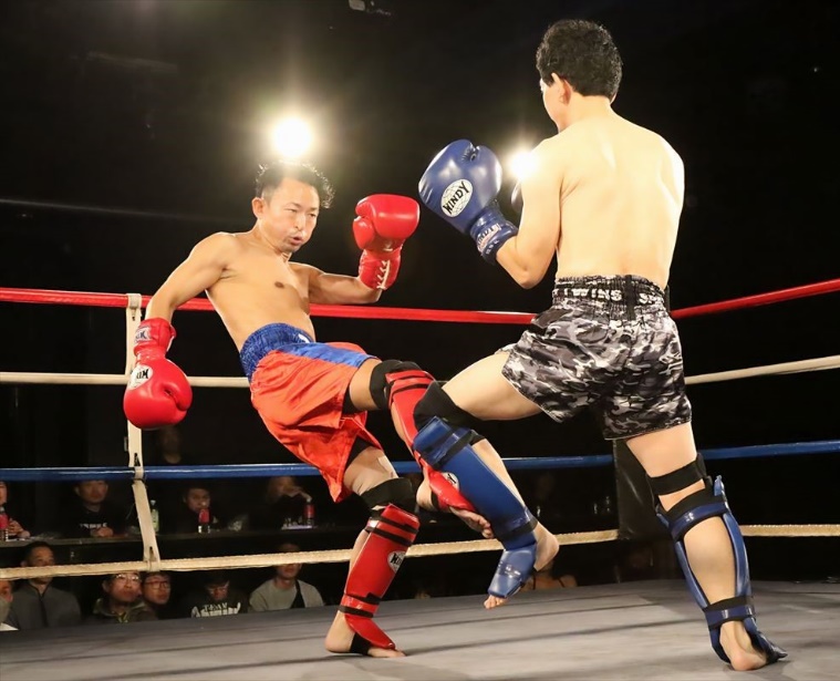 TOMOTAKA(右)の右フックが角のアゴにヒット