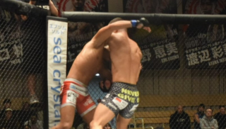 2R、上下に散らす打撃から、新井のタックル。またもろ差しになる。打撃からのタックルを上手く使う新井にレスリング力の進化が見られる。際からの離れ際にまたしても田上のヒジ。ヒヤリとなる。しかし、新井も大ぶりのフックなどで応戦。打ち合い上等の新井は構わず前にプレッシャーをかける。新井優勢のままラウンド終了。