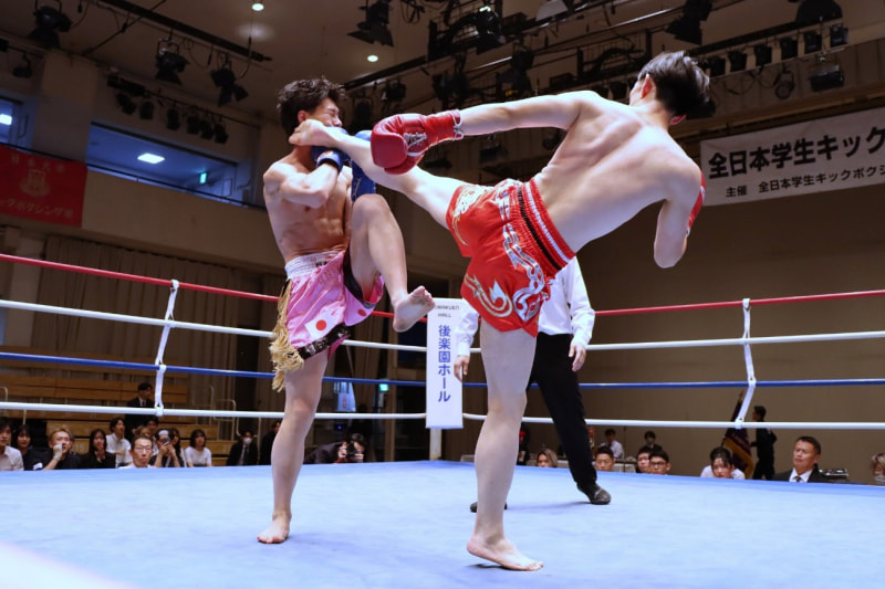 開始早々、左ハイキックをで先制する平川(右)