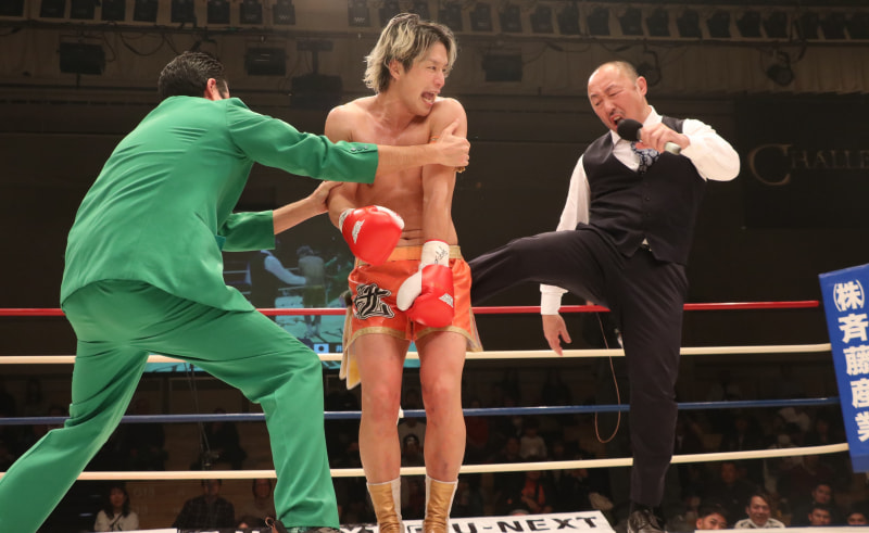 高橋は勝利後、武田幸三のタイキックを尻に受けて悶絶