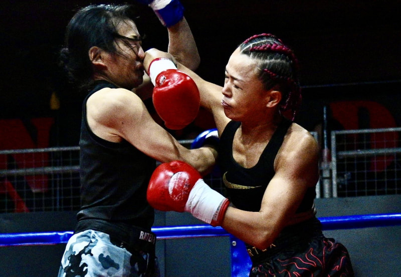 坂村優子(左)にヒジを打ち込む山本玲(右)