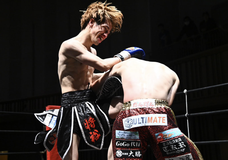 吉角綾真(右)をヒザで追い込み、新王者に輝いた藤原将裕(左)
