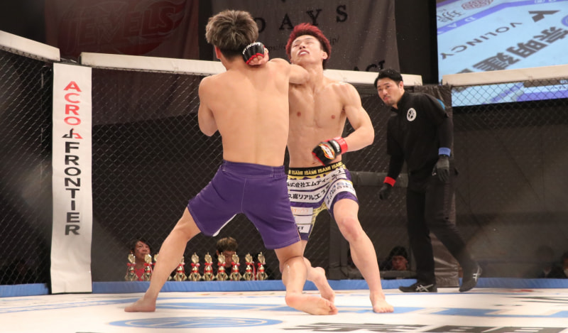 中務(手前)は小崎とフックの打ち合いでダブルノックダウンに