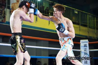 3R、ダウンをしてしまった山下が挽回すべく距離を詰め白谷を倒しにかかる。カーフを細かく当てる白谷は前進する山下にカウンターパンチを狙う。両者大きなパンチが交差すると残り30秒、山下の右ストレートと左フックが白谷を捕える。