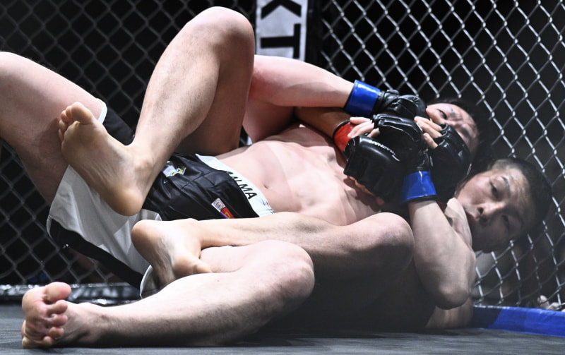 山田哲也(左)をチョークスリーパーで下した林 RICE 陽太(右)