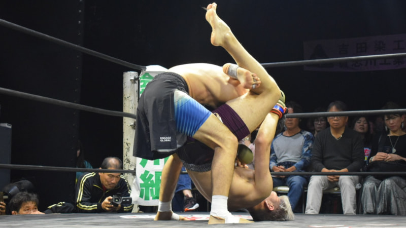 三角絞めを仕掛けるライアン(右)