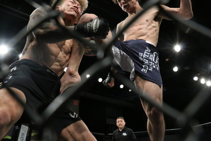 2R、笹は執拗に組付き、藤井の動きを封じようとするが、ラウンド残り数秒のスタンド攻防、藤井がパンチをヒットさせると、顔面飛びヒザ蹴りをヒット!笹が倒れると、藤井がパウンドにいくと、レフェリーが試合を止めた。