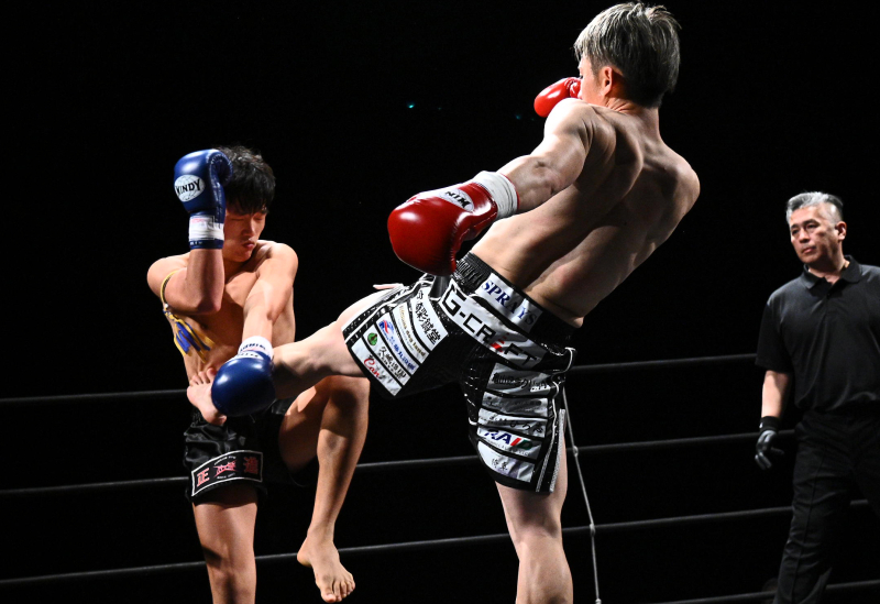 三日月蹴りでダウンを奪った西本竜也(右)