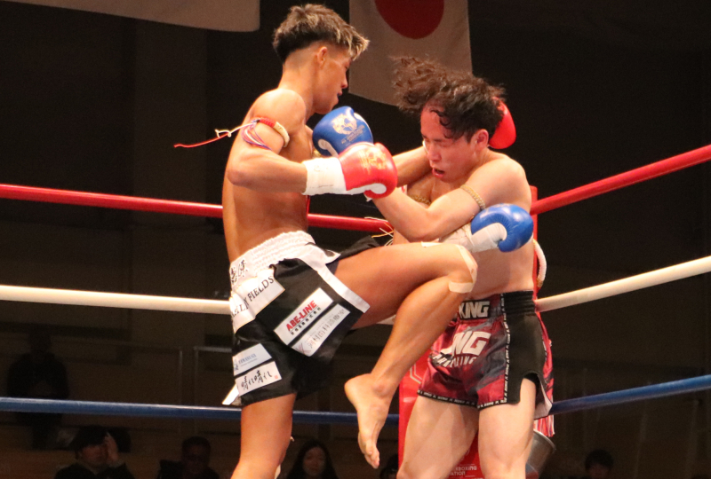 協会ホープのKAI×A.K.Gがパンチ、肘、膝連打を浴びせ、2Rタオル投入を呼び込みTKO勝ちを飾った。