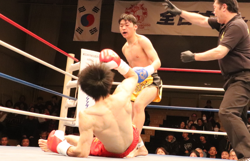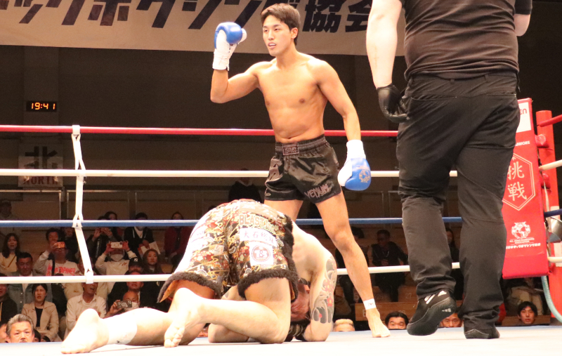 プロデビュー戦となるソン・ミンチャンが、全日本ランカーの山田旬に思い切りよく打ち抜くストレートで3ダウンを奪い1RKO勝利を決めた。