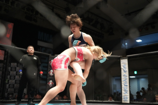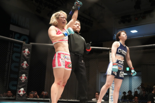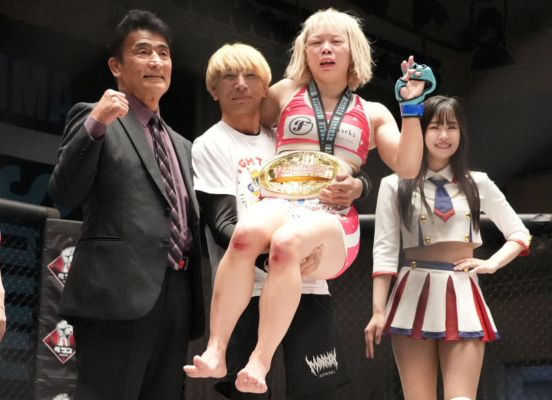 勝利した青野は悲願のベルトを腰に巻くと「私が修斗の顔になれるように頑張る」と号泣。すると、夫の渡部修斗と、義父で修斗初代ウェルター級王者の渡部優一氏がリングイン。実は30年前のこの日に渡部氏もベルトを獲得し、勝利後のリングで幼い修斗を抱えて記念撮影したと告白。すると、修斗が青野をお姫様抱っこし、三人笑顔で記念撮影した。