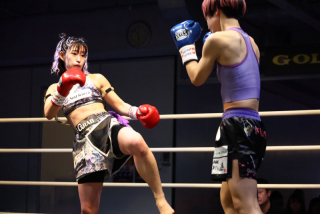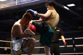 再開後、蹴りで距離を取る裕二を、大成が強引に詰めてパンチを振るう。距離が詰まると、裕二は組んでのヒザ、左ミドル。もらいながらも大成は前に出てパンチ。