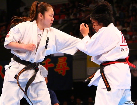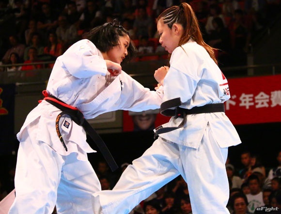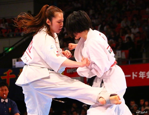 荒木(左)は突きの打ち合いの中で、下段回し蹴りやヒザ蹴りを出す