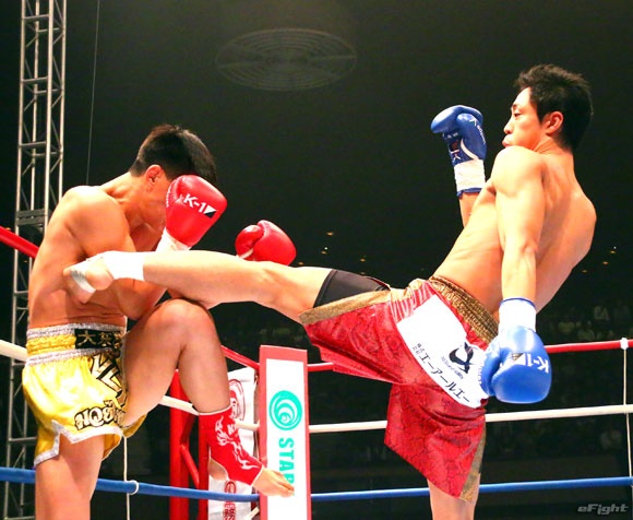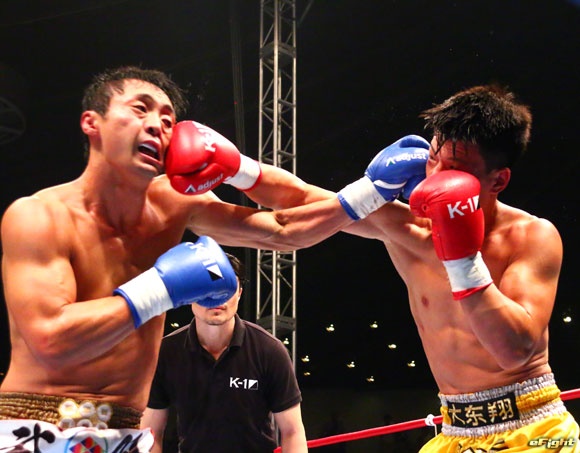 小宮山(右)はガードが甘く、チー(左)のパンチを何度もまともにもらう